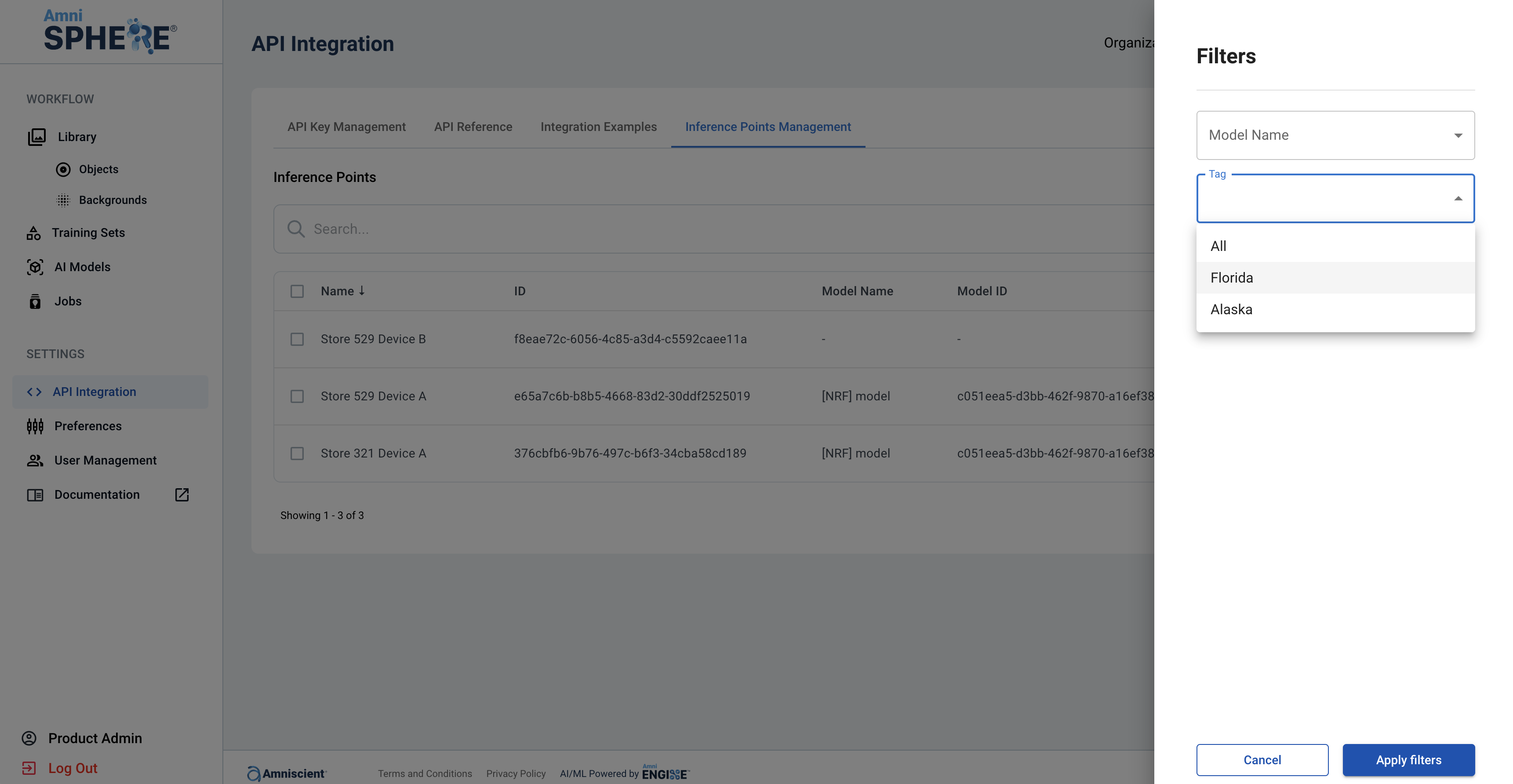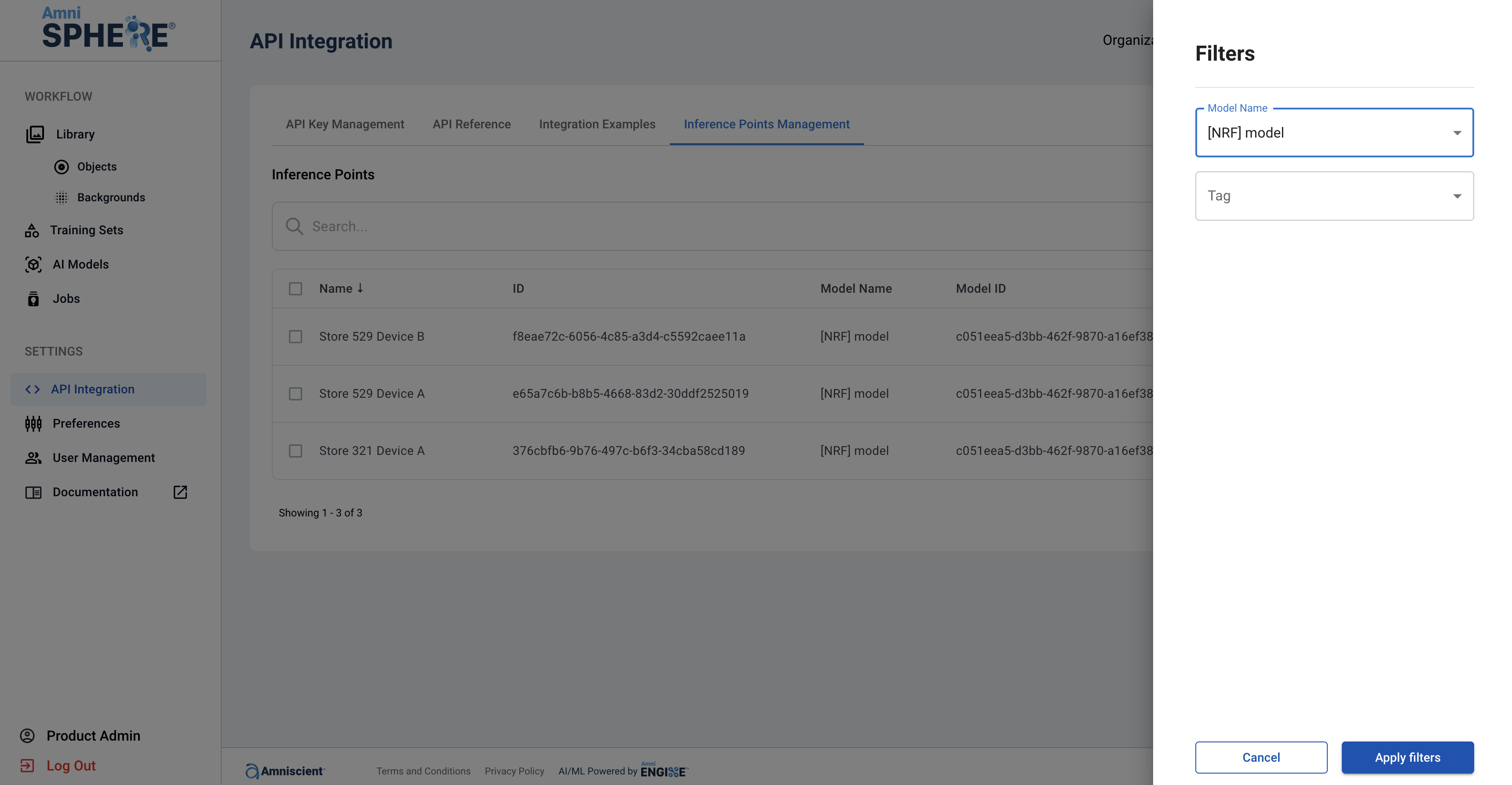 Another option when filtering inference points is to filter by the associated AI model. This is a good option if you are replacing an older AI model with a newer build and want to make sure that all references to an older AI model are updated.