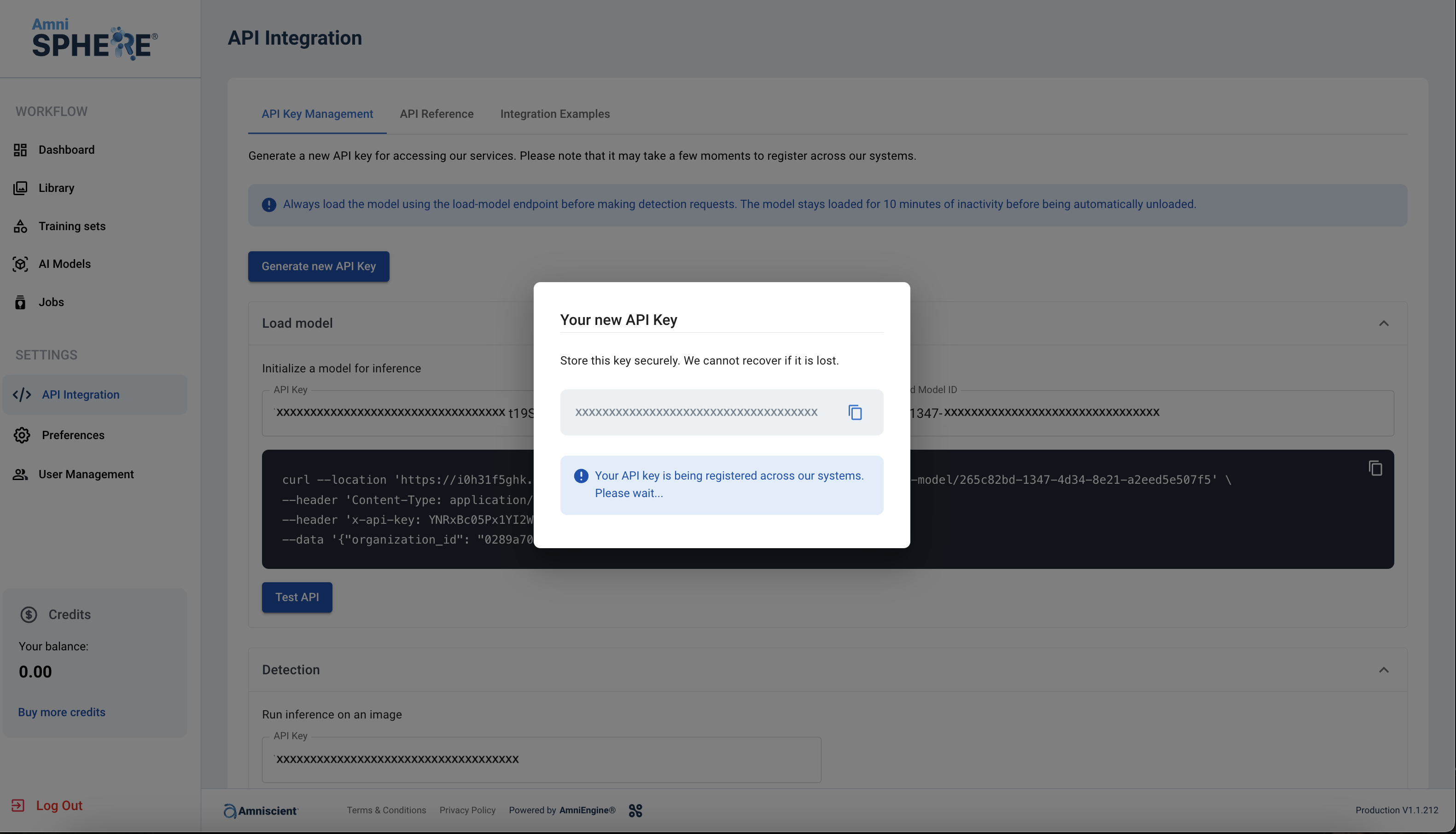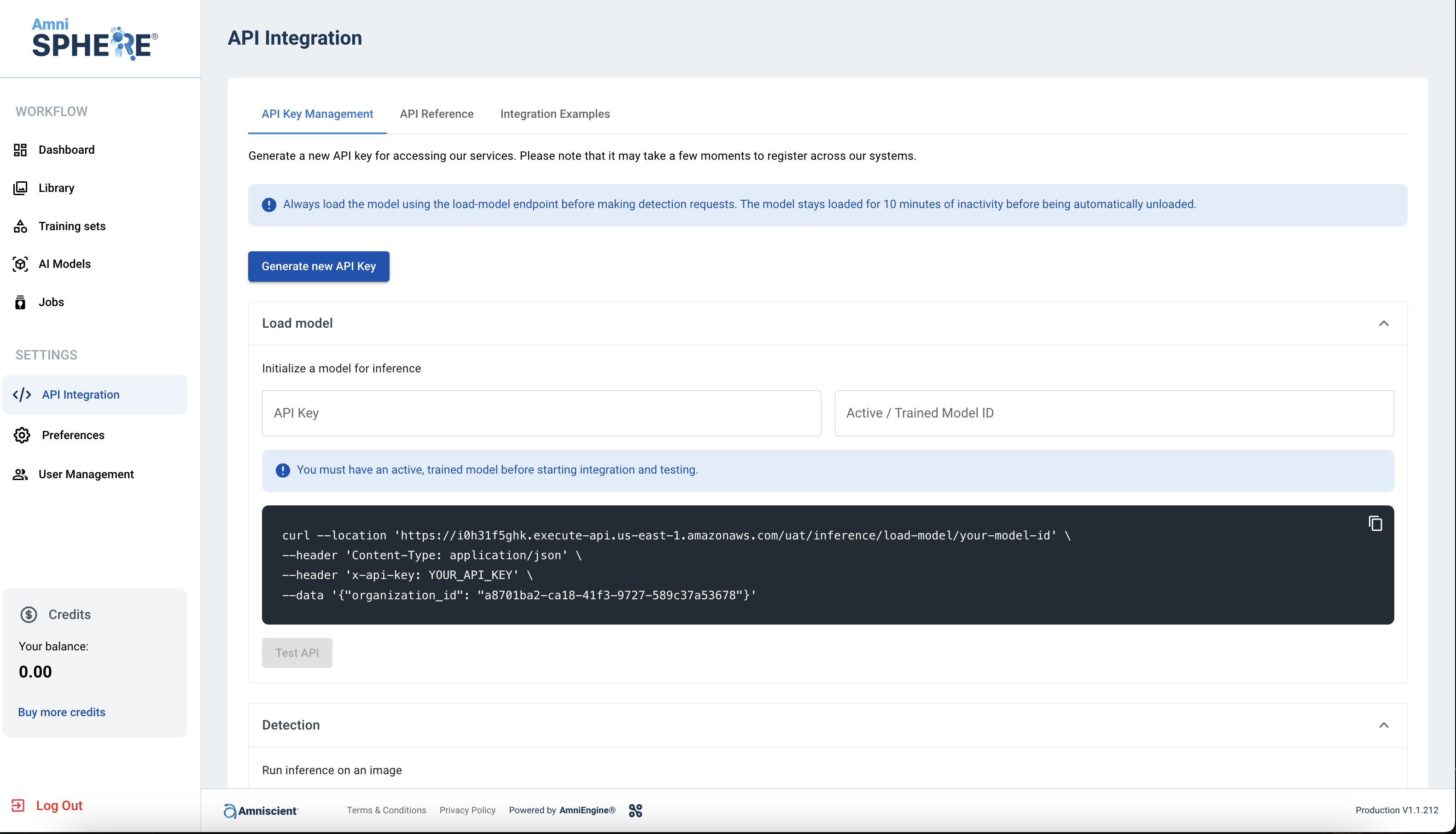 After logging in using your Amniscient credentials, navigate to the API Integration tab. In this tab you can generate API keys, test endpoints, and view integration samples.