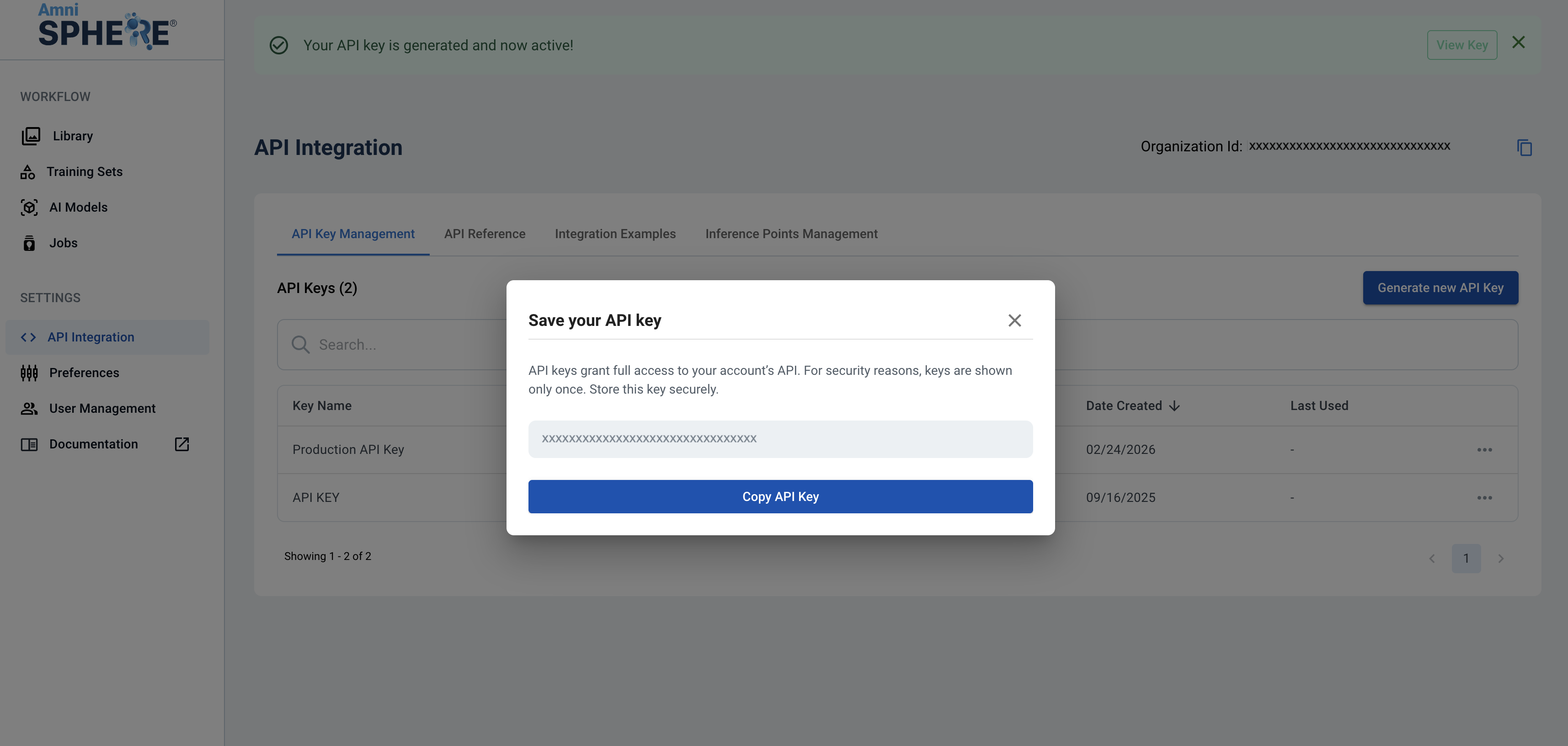 Once you click on the “View Key” button, your newly generated API key will appear in a modal. Before closing this modal, remember to securely store your API key for development. This is the only time your API key will appear on our platform! Note that we cannot recover your API key if it is lost.