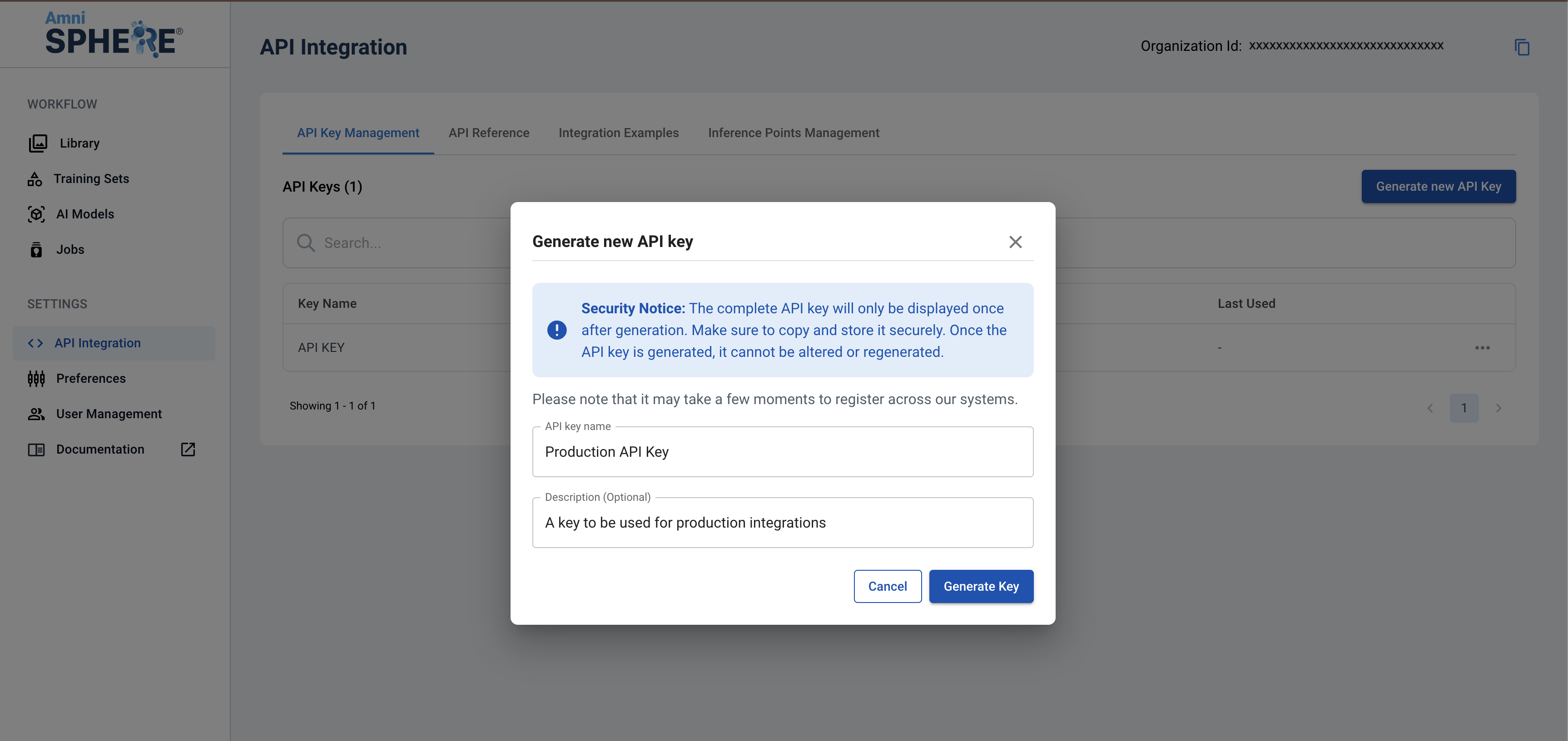 Click on the “Generate new API Key” button. A modal will appear with a required name for your API key, and an optional description for the purpose of the new key. Once you’ve entered the required information, click on the “Generate Key” button.