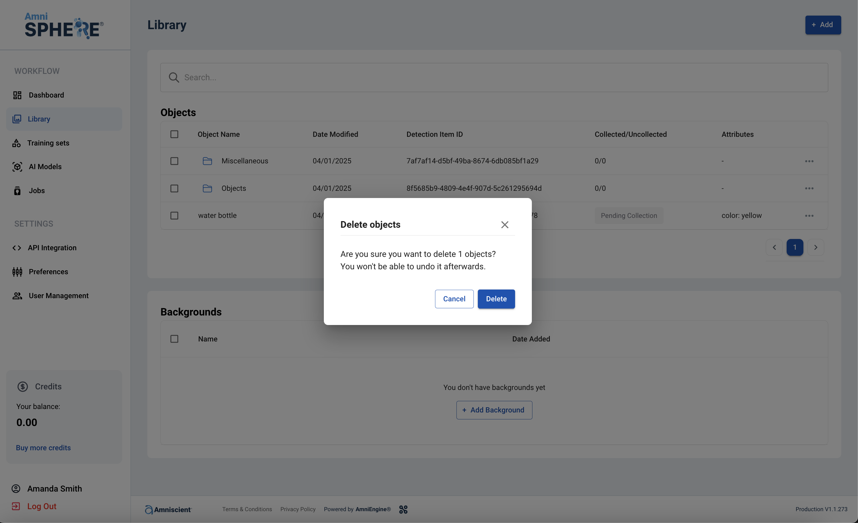 A popup will appear to confirm that you’d like to delete the folder. Click on the “Delete” button to delete your folder or click on the “Cancel” button if you’d like to cancel deleting your folders. Your folder will be permanently deleted immediately upon clicking delete, and will no longer be available on the AmniSphere website or within the mobile app.