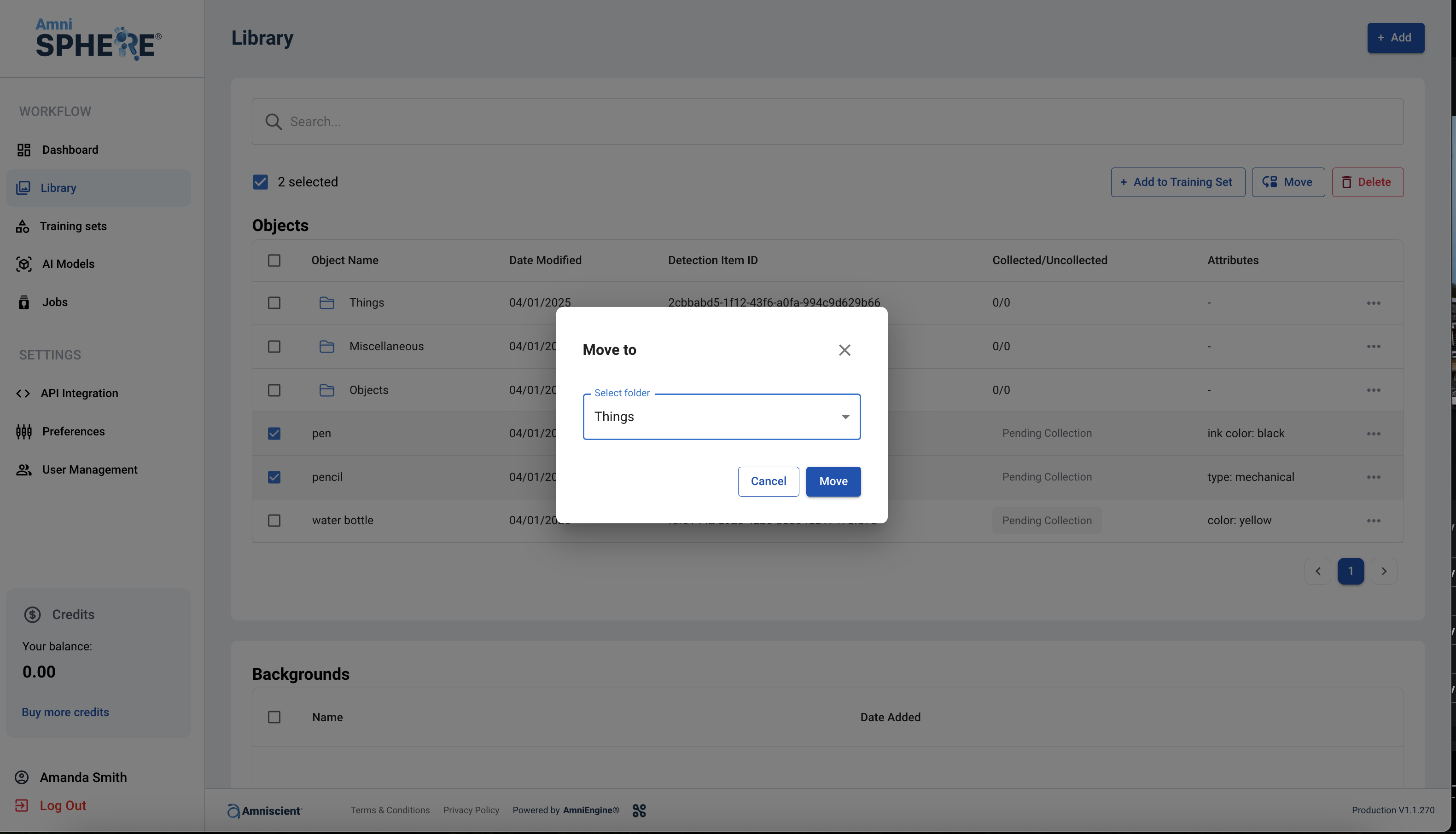 A popup will appear on screen prompting you to select the folder you’d like to move your objects to. Select an existing folder from the dropdown and click on the “Move” button. If you’d like to cancel moving your objects instead, click on the “Cancel” button.