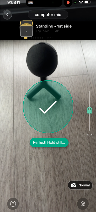 You have the ability to adjust your camera lens setting during collection. For most objects, the default “Normal” lens setting should be kept. If you are collecting a smaller object and find it difficult to get close enough to meet the distance requirements, you can tap on the “Normal” lens setting and it will switch to the “Close Up” lens setting. You can tap on this setting to change it back at any time.