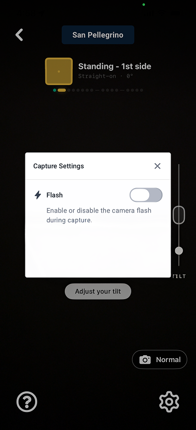 You have the ability to enable or disable flash on your camera during collection. By default, flash is disabled for collection. It is recommended to keep flash disabled unless your collection environment is very poorly lit. To enable flash, tap on the gear icon on the bottom right of your screen during collection. In the popup that appears, toggle the flash setting to enable it. You can toggle this setting again to disable flash at any time.
