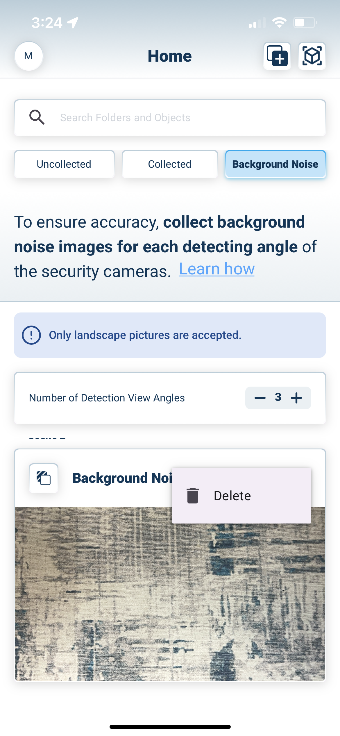 Log in to your AmniSphere mobile app. You will be taken to a view of your current folders and objects. Tap on the “Background Noise” tab to view all background noise images you’ve captured.