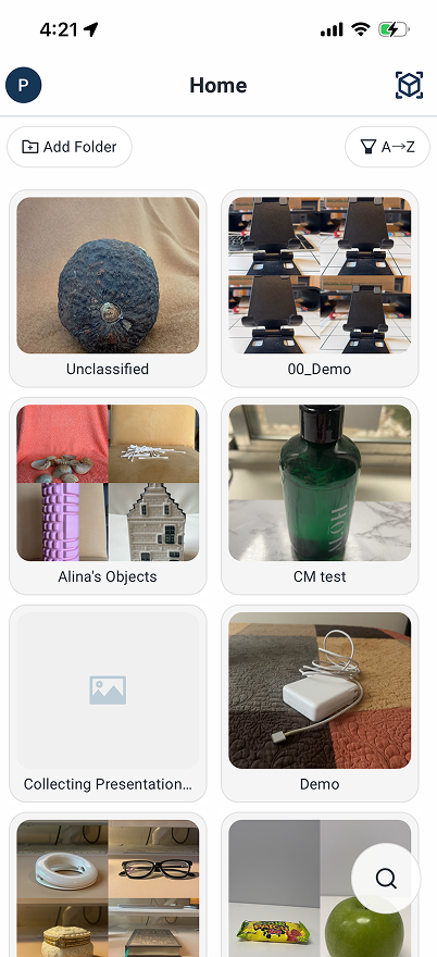 Log in to your AmniSphere mobile app. You will be taken to a view of your current folders and objects. Tap on the cube icon in the upper right corner.